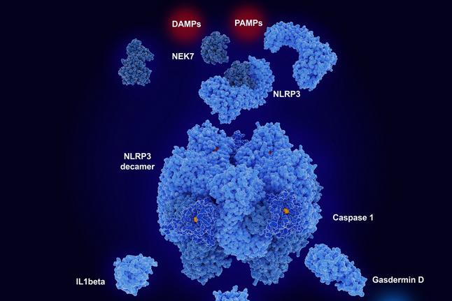 Inflammasomes are multiprotein complexes involved in the activation of caspase-1 and the processing of the pro-inflammatory cytokines, interleukin (IL)-1beta and IL-18 as well as the cell death mechanism of pyroptosis. The basic components of inflammasomes are a protease, caspase-1, the adaptor protein apoptosis-associated speck-like protein containing a caspase recruitment domain (ASC), and a sensor molecule, e.g. a NOD-like receptor (NLR) such NLRP1, -2 or -3, AIM2 or pyrin. Inflammasomes are activated by DAMPs such as ATP, fatty acids, DNA or PAMPs as Bacillus anthracis or flagellin. However, some inflammasomes respond to more than one type of inflammasome inducer, e.g. the NLRP3 inflammasome is assembled in response to reactive oxygen species (ROS) or ATP.